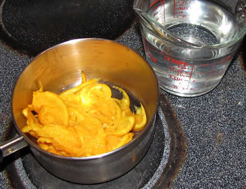 Finalmente, combine el agua y la pulpa naranja escurridas mush, en una cacerola mediana y poner a hervir. Bajar la temperatura a medio y cocine a fuego lento hasta que estén suaves (unos 5-7 minutos). Retire del fuego, escurra bien y desechar el agua.