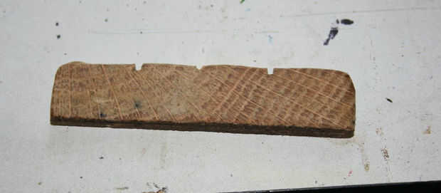 Pude encontrar una delgada 2 1/2 pulgadas pedazo de largo x 1/2 ancho de madera para utilizar como uno de mi puente. Utilicé el papel de lija 150 grano para redondear los bordes del puente wooding y cuchillo de filete para hacer 3 pequeños bosquetes un 1/3 pulg alejados uno del otro. Para el segundo puente pude encontrar un pequeño fino 2 pulgadas largo x 1/3 en amplia pieza de plástico a utilizar y corte 3 pequeños bosquetes un 1/3 pulg alejados uno del otro en él.