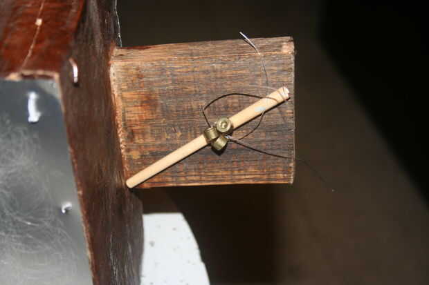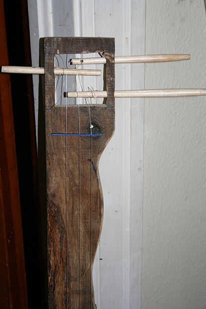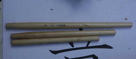 Usé 3 viejo No.5 pintura del pincel que corte las puntas de como mis clavijas. Para hacer un agujero para la cuerda en cada clavija primero inserté una clavija en cada agujero de la clavija y utilicé mi Dremel y una broca de 5/64 para hacer los agujeros de la cadena en cada clavija. Después de hacer los agujeros me inserta un trozo de cuerda de pesca en cada uno de mis pinzas y usar varios nudos corredizos para asegurar cada pedazo de cuerda. Que utiliza la secuencia de la prueba de 20 libras para la clavija de la parte inferior, 30 libras de prueba cuerda de la clavija superior y secuencia de la prueba de 50 libras para la clavija media. Después de asegurar la cuerda a las clavijas funcionó a través del agujero pequeño en la sección de 4 pulgadas en la parte inferior del Shamisen. Tuve un extra 4 pulg pieza de brocha que envuelve cada trozo de cuerda alrededor varias veces y asegura cada pieza con unos nudos corredizos.