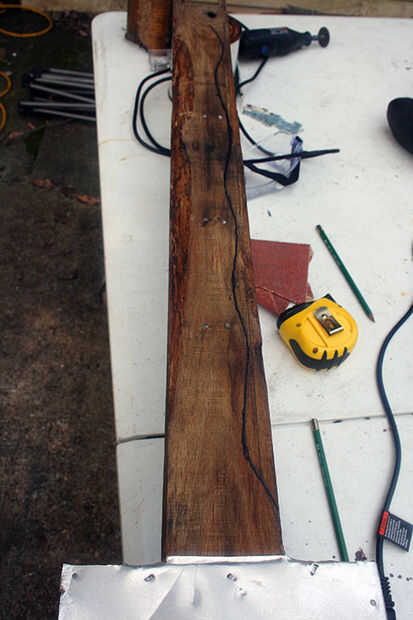 Después de mirar la pieza acabada, que decidí que el Sao (cuello) era demasiado, así que patrón de onda se basó en un lado de ella y utiliza una plantilla vio a cortarlo. Una vez que cortar usé el plano del bloque para redondear los bordes y arena suave. También he pintado los símbolos japoneses de música a un lado de Dou (cuerpo).