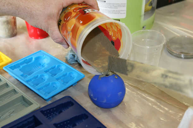 Una vez que está suficientemente mezclada son listos para servir. Tome un momento y sumerja el molde en agua. Totalmente sumergida. luego tomar algunas de las cosas acuosa y ponerlo en, swish en los recovecos y rincones. Luego con cuidado Vierta el resto. El molde de estrella de la muerte realmente necesita un embudo, pero cuidado de verter mientras que usted golpee firmemente en el lado hasta el molde si completo. En el caso del molde de estrella de la muerte, va a mentir. Mantenga golpear ligeramente, mantener verter. Dentro de la forma de forma de un cono periódicamente usted debe golpee firmemente todo el asunto sobre la mesa para aplanar hacia fuera. Una vez que el molde esté lleno, raspar apagado el exceso para que sea un poco sobre la parte superior del molde.