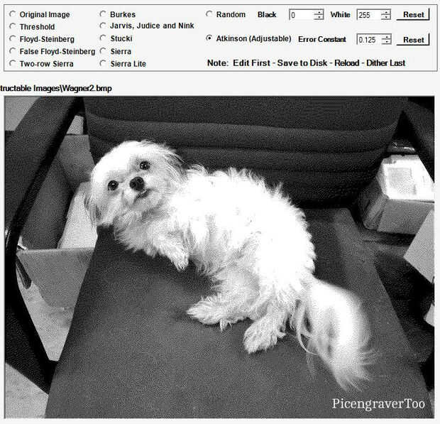 Aquí voy a explicar cómo al diodo láser graba usando una imagen en blanco y negro interpolado el método estándar TTL (pulsación). Usaremos la misma imagen de Wagner, pero se traduzca en primer lugar. PicEdit Lite tiene 11 algoritmos diferentes para elegir, pero vamos a utilizar la opción "Atkinson" y dejar la configuración por defecto en.125 para este grabado.