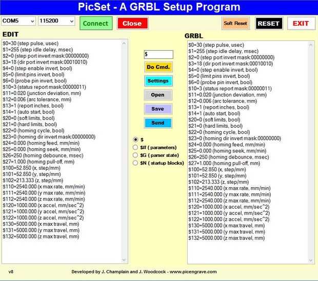 PicSet nos permite guardar diferentes perfiles grbl configuración, así que tenemos que cargar los TTL grabado esta vez. Pasé por la misma rutina de ajuste el punto focal basado en altura de materiales, excepto para correr dirección se invierte este tiempo y necesitábamos establecer la Z cero punto de partida un poco diferente.