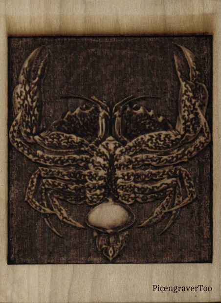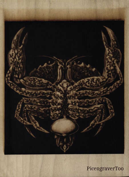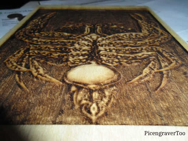 El grabado final salió con negro la carbonización de la madera donde estaban las áreas negras en la imagen. Para quitar la carbonización que utilizamos nuestro compresor de aire con 150 PSI para soplar el material quemado suelto. Después quitamos la madera socarrada, la profundidad de corte es. 05"(1,27 mm) de profundidad. La carbonización fue causada por nosotros no usando una boquilla de asistencia de aire como el CO2 comercial uso de máquinas de grabado. Una boquilla de aire ayuda a soplar el material quemado como el Laser de viga es un corte en la madera.
