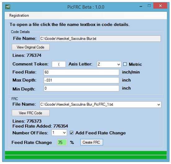 El cero punto del eje Z de una energía más baja fue en 500mv del voltímetro. Que fue Z-.004 (Z-.101mm) trotando abajo de 0v en el voltímetro. Estos ajustes nos trajeron para arriba más cercano al borde de los 5v a la modulación antes de que el codificador de eje MA3 salta a 0v otra vez que interno nos da la potencia máxima de salida en nuestro completo ajuste de la profundidad de Z-.031 (Z-.787mm). Para expandir las sombras a las profundidades de los negros se convierten en punto de corte en lugar sombreado de 8 bits, utilizamos una reducción del 75% de la tasa de alimentación en PicFRC.