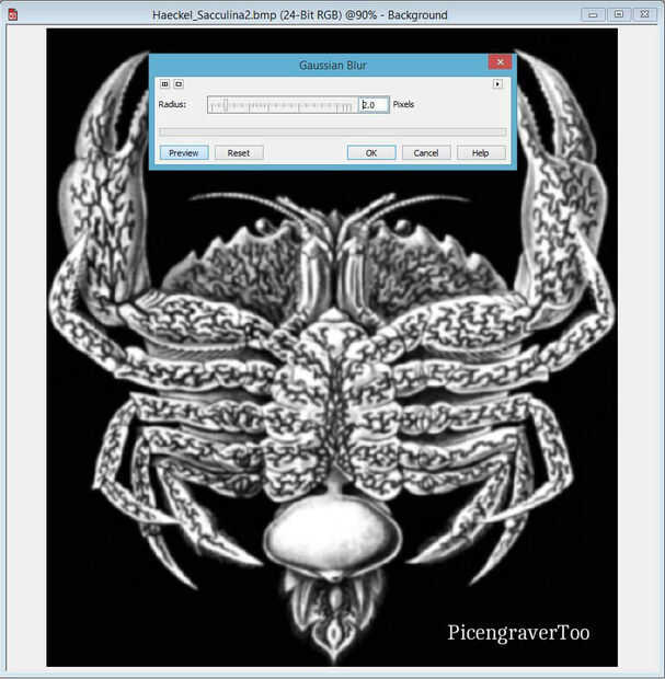 Utilizamos Desenfoque gaussiano en Photo-Paint para suavizar los bordes más agudos ligeramente desde el afilado previo que hicimos sobre la imagen original. Sé que esto suena confuso para enfocar y Desenfocar luego, pero la original afilado en PicEdit Lite sacó con más detalle a la imagen original que tenía muy poco para comenzar con. El desenfoque gaussiano que hicimos luego alisa este detalle y filos que la alimentación variada de la rampa de láser diodo dentro y fuera de las zonas de transición de sombra más suave.
