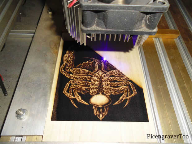 Hemos hecho D 2,5 & grabados 3D del huso en el pasado en nuestras otras máquinas CNC e incluso diodo láser grabado pedacito 8 tonos en grabados de alivio 3D del huso de madera. Hemos sido capaces de lograr esto mediante la sincronización y combinar los dos archivos Gcodes de cada proceso mediante nuestro programa recién estrenado había llamado PicLaser 3D. Esto nos permitió tener coordinación de diodo láser siga superficie contorneada de material moviendo el eje Z hacia arriba y hacia abajo, pero todavía tienen el eje de A controlar la intensidad varió del diodo láser para el sombreado. Un video de nuestro servo 4 ejes controlados diodo del huso/láser máquina de grabado del CNC utilizando este proceso muy singular puede ser visto aquí. Esta máquina CNC utiliza dos de los mismo 9mm Nichia 445nm láser diodos con una potencia de salida máxima de 4.5W.