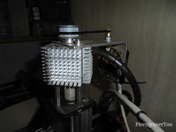 El ventilador monta para enfriar el paso a paso también es menor para evitar esta interferencia magnética también, pero hemos doblado el aluminio un poco donde el ventilador se monta para apuntar el aire que sopla en el motor paso a paso. Ya que estamos empujando este motor de pasos bastante duros con mayor amps, aceleraciones más altas y teniendo en cuenta que está cambiando direcciones rápidamente, tenemos que añadir disipadores de calor para los cuatro lados. Encontramos algunos disipadores de calor en Amazon que se ajustan perfectamente a la nema 17 pasos. Con alguna pasta térmica aplicada a los motores paso a paso y algunos cables de seguridad inoxidable, pudimos apretar todos ellos alrededor de los cuatro lados. Se necesitaba un recorte en un disipador de calor para limpiar los cables del motor paso a paso.