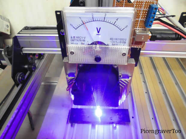 Enfocar el diodo láser del eje Z debe mover todo el camino hacia abajo hasta que el eje Z fondos hacia fuera en los. 250"(6.35 mm) placa de aluminio y el se desliza paso a paso. Pone a cero el eje Z en PicSender allí. Utilizamos un. 375"(9.52 mm) pieza gruesa de color negro anodizado aluminio para derribar el rayo láser de enfoque. Puesto que los pasos en 1/3 de lo que debería ser, nos jog hasta un total de 1,125". (28.57 mm) el voltaje a la modulación será entre 0-5v, pero correr un poco hasta o hacia abajo, dirección a lo que es se cierra a 1v en el voltímetro. Un poco de carga procedentes del diodo es necesario para ver el punto focal para el ajuste.