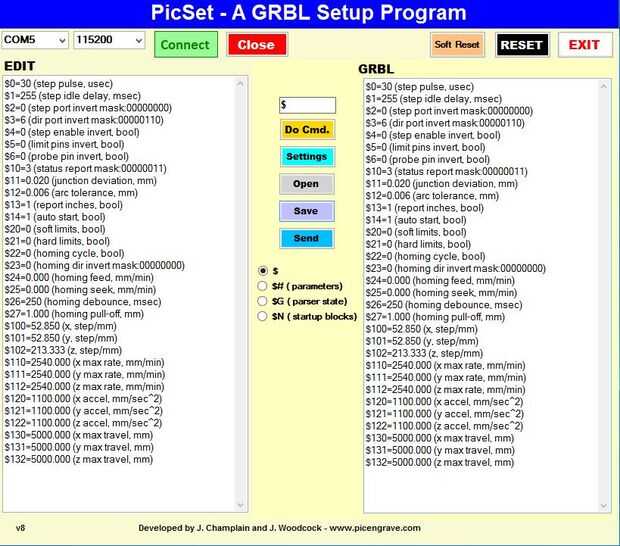 Como se explica en lente paso 4, el láser diodo tiene que estar debidamente colocadas fuera de la mesa. Voy a explicar cómo enfocar la lente más adelante, pero irá a la configuración grbl primero porque esto afecta este proceso. En la PicSet captura de pantalla todos nuestros ajustes de muestra en nuestras 2 Shapeoko de variada intensidad controla grabado láser.