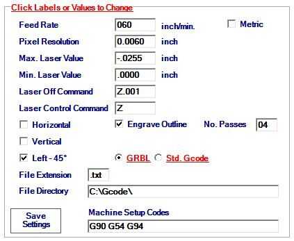 Píxeles de resolución es como la gcode se generará para el paso largo y paso adelante movimientos incrementales en nuestro programa. Si usamos un ángulo de grabado de Horizontal o Vertical con un. 006"(.152mm) píxeles de resolución y un. 005" (.127mm) laser quema la línea, esto provocará que las líneas en nuestros grabados Laser. Utilizando el ángulo de 45 grados en los ajustes, el. 005"(.127mm) línea de quemadura de láser se superponga ligeramente y líneas no aparecerán en el grabado del Laser.