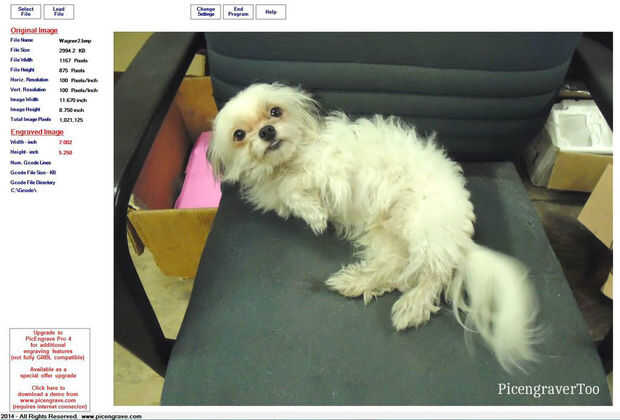 En el cuarto cuadro muestra los ajustes de utilizamos en PicLaser Lite para 8 bits láser grabar Wagner. Aviso en el cuadro 5, con la resolución de píxeles de. 006"(.152mm), la imagen se graba en 7,000" X5.25 "(177.8mmX133.35mm). Esto confirma nuestros cálculos para los tamaños de píxel que encuentra en PicEdit Lite.