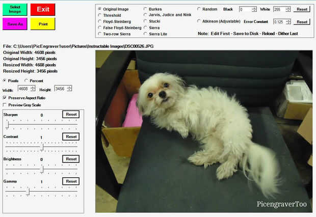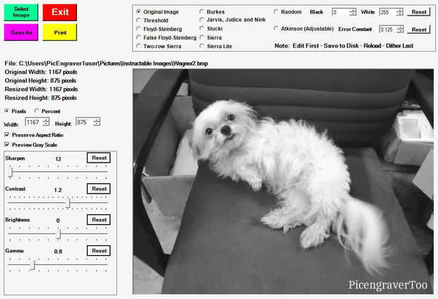 La tercera imagen muestra los ajustes de imagen que se utilizó basados en imagen de Wagner y por rango de potencia de nuestro diodo láser en el Shapeoko 2. Grabado en PicEdit Lite hay una selección de "Escala de grises vista previa" para tener una idea general de cómo el grabado se verá como después de él.