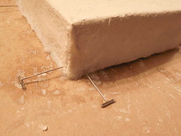 Puede utilizar cintas para mantener arriba a los lados, pero es mucho más limpio para utilizar t-pins, que es si usted está usando un bloque de espuma como su forma, de lo contrario use cinta de papel juntando las esquinas, esto hace que el borde sea segura desde el interior.