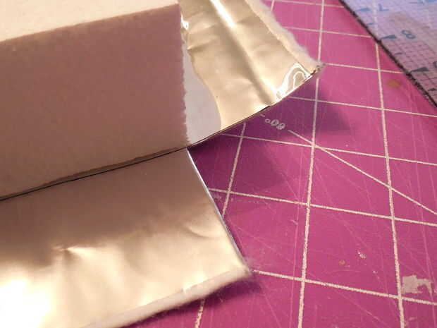 Coloque los SS, de la hoja hacia arriba, marca red centro, localice el centro a los bordes del cubo de espuma. Esto ayuda para la colocación del cubo. A partir de un borde, línea de espuma y marcar las esquinas, después de todo 4 lados tienen esquinas les marcadas corte hacia fuera. Usted puede dejar un poco extra por un lado, si usted quiere doblar un poco más. Sólo corté cuadrados de mina; el yeso ayudará a cubrir los bordes.
