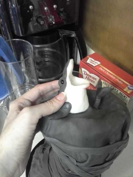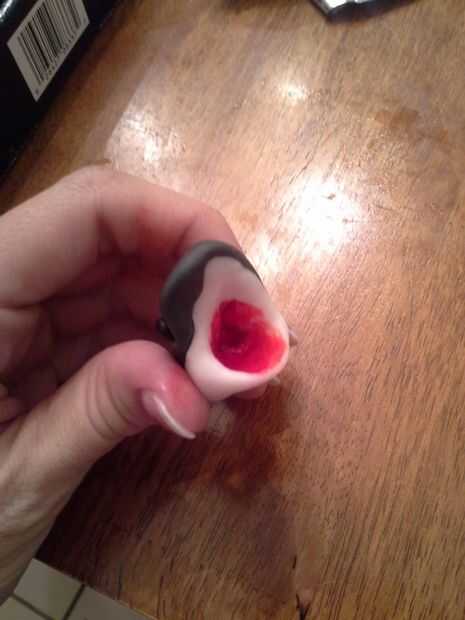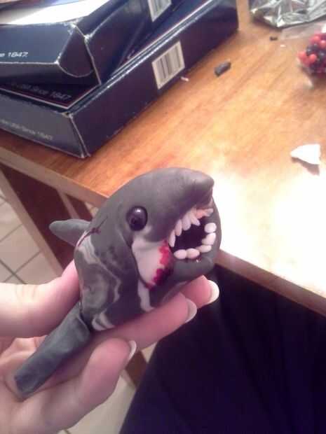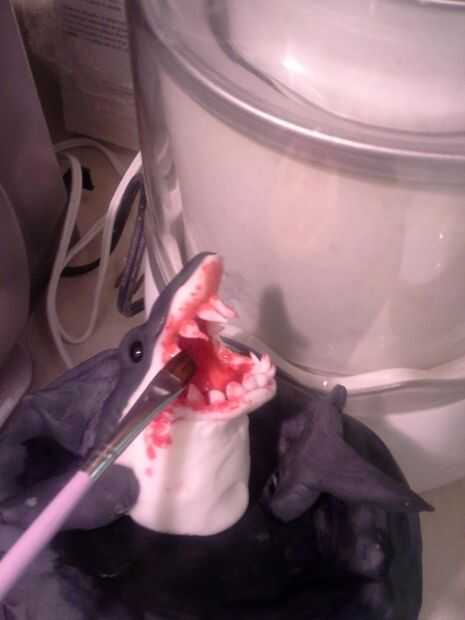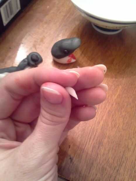 Ahora tire pedazos pequeños de fondant blanco para los dientes de tiburón de forma. Les se adhiere a las bocas de tiburones utilizando pequeñas cantidades de agua. Esto es algo tedioso, pero el tiburón necesita dientes! También pinté algo de sangre en los dientes para efecto añadido. Con clase.