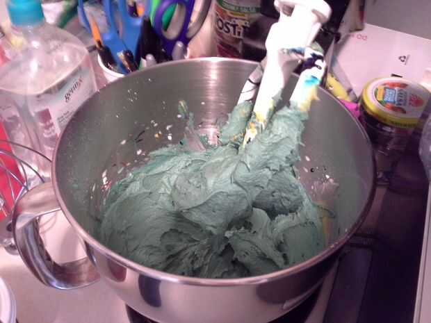 Cuando el pastel se haya enfriado, tomar aproximadamente un cuarto taza de su baño de vainilla. Mezclar el restante helando con suficiente color gel azul para hacer un profundo Océano Azul. He añadido un poquito de negro y amarillo--un muy poquito, para que sea un color agradable, oscuridad, seafoam verde.