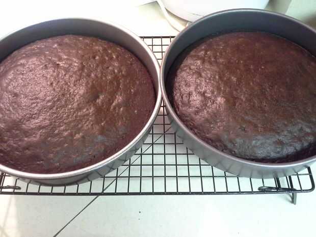 Hacer su pastel en caja restante, según las instrucciones en la parte posterior de la caja. Vierta la masa entre dos moldes redondos y hornear. Sacar pasteles cocidos del horno y deje enfriar a temperatura ambiente.