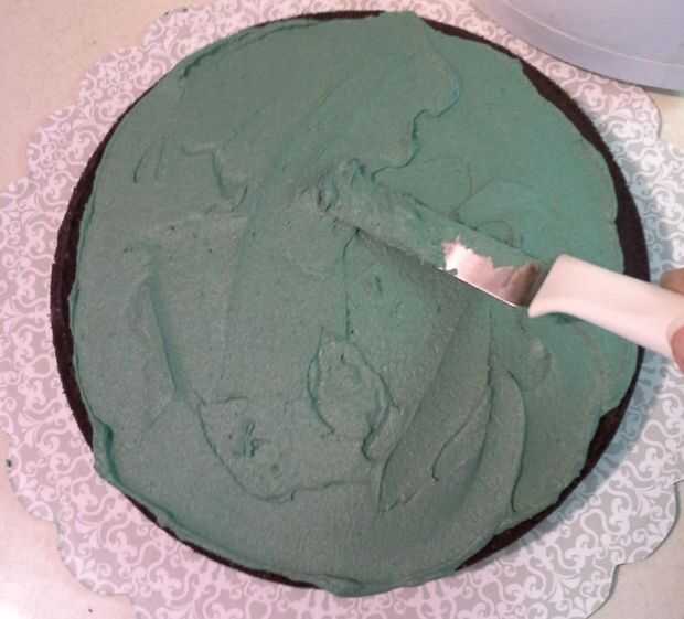 Una vez la capa de miga, tomar el glaseado restante de azul y verde y helada de la parte superior y los lados de su torta.