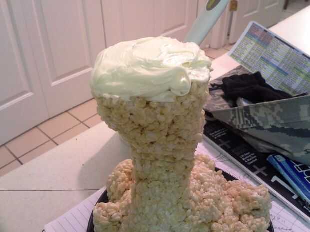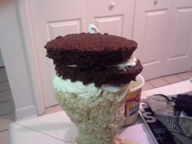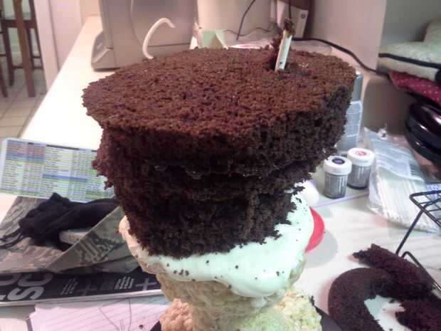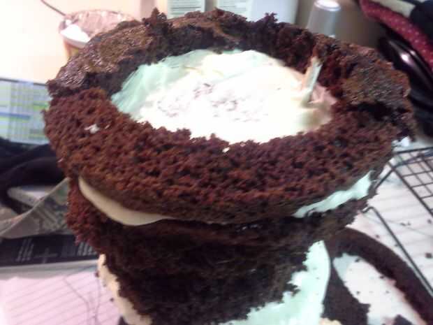 Una vez que tus círculos se apilan, helada del círculo superior y coloque una pequeña capa de pastel (de restos) alrededor de los bordes para formar un labio en la parte superior sharknado. Frost la estructura entera sharknado, teniendo cuidado de no rasgar el pastel. Coloque en el refrigerador hasta frío, 1-2 horas.