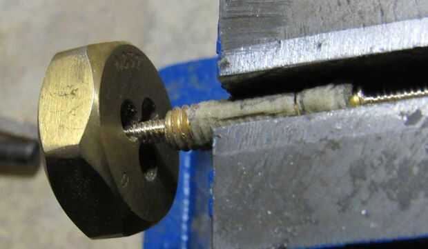 • Coloque el tornillo de la presentada en un tornillo de banco y utilizar un troquel de corte #6-32 para cortar roscas en los extremos. Inversa de la matriz para obtener hilos de rosca a la parte inferior.