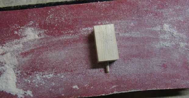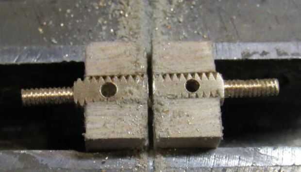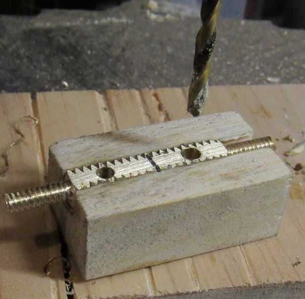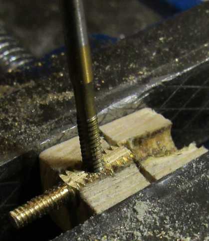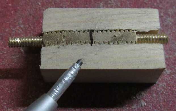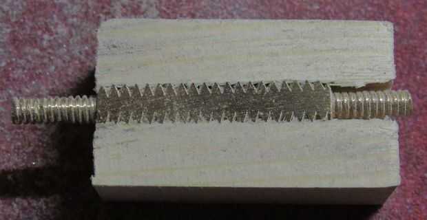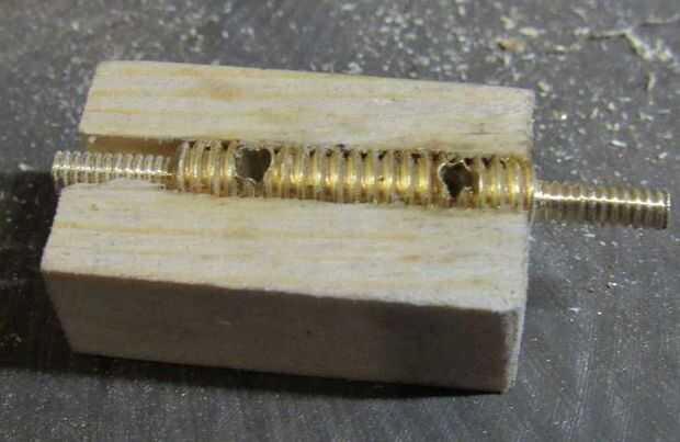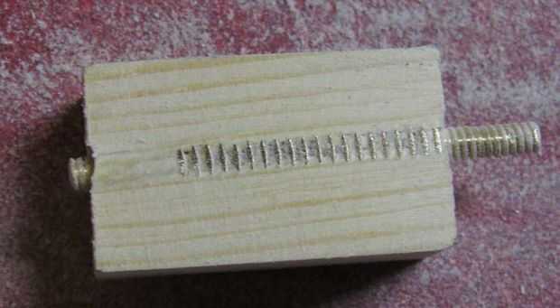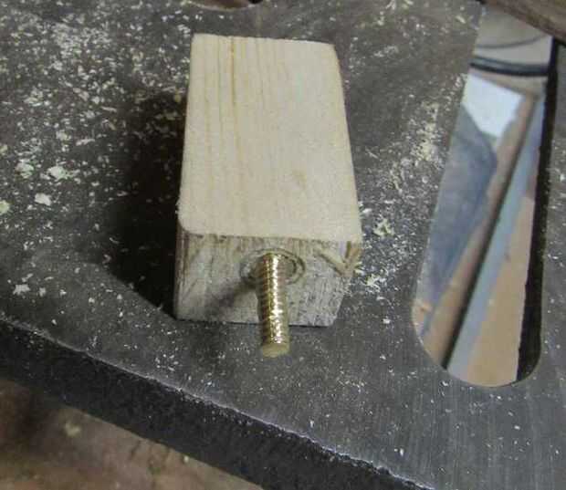 2. Atornille el tornillo de doble rosca en el bloque de madera blanda. Utilice #6-32 tuercas para ayudar si es necesario.