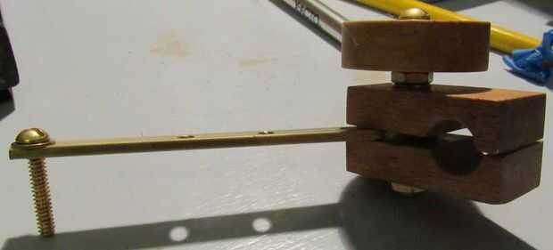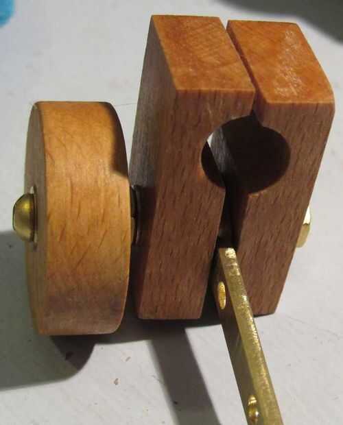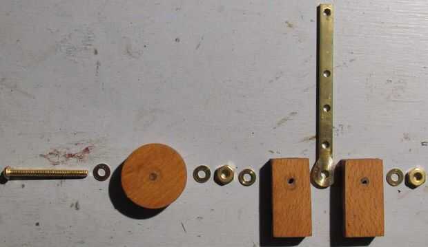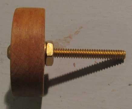Los agujeros adicionales a cada lado del agujero del centro son un error. La perilla se lleva a cabo en lugar por un tornillo con una tuerca en el lado opuesto para mantener fijo el tornillo. Porque el agujero de sharpie en el bloque de madera es cónico, asegúrese de que se enfrenta a la forma correcta durante el armado.