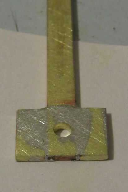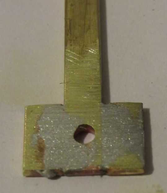 La interfaz entre el metal de la brújula y la madera de la sharpie con bloque debe tener una mayor superficie para que al par de rotación de la sharpie no daña la madera. En este paso, se incrementa la superficie del metal 1/4" latón amplia soldando tiras adicionales a cada lado. Puede perforar el orificio antes o después de este paso: