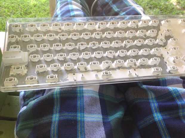 Ayudo en el jardín de Pinckneyville Middle School. El otro asesor jardín, Mim Harris, sugirió que los estudiantes utilizan teclados viejos para hacer marcadores de la planta. Los estudiantes están entusiasmados con el proyecto y ponen la etiqueta de