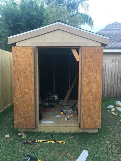 No cubro cómo tejas el tejado ya que hay toneladas de grandes videos en You Tube sobre este. Para la entrada, quería tener en su lugar una puerta grandes puertas dobles. Pues yo utilizaba el método de sandwich donde utilizas 2 × 4 en el centro del marco y añadir OSB para la espalda y el revestimiento de la parte delantera. Todos se asegura con tornillos.