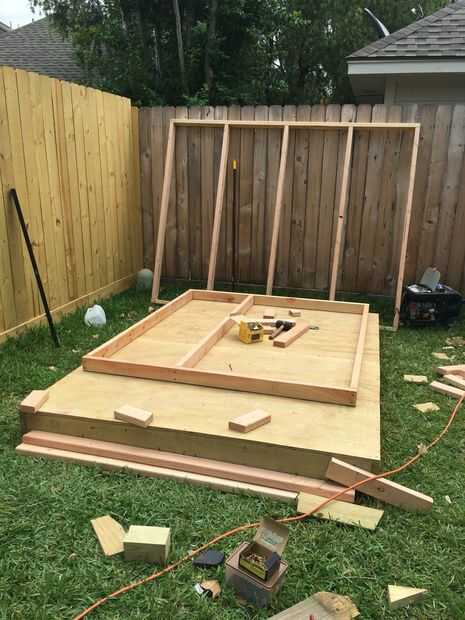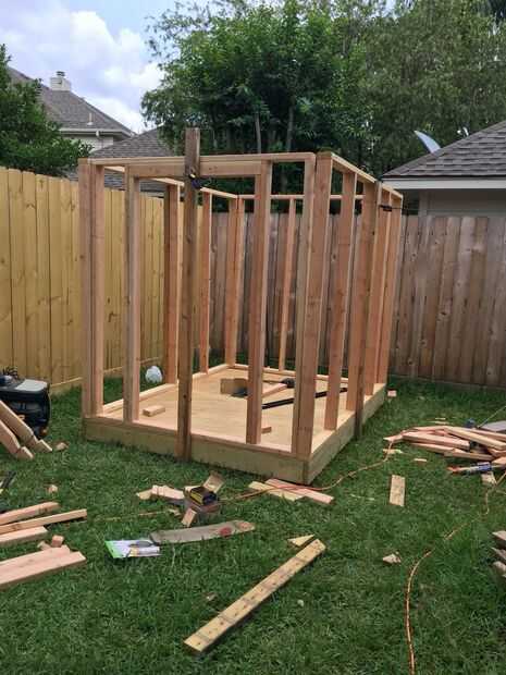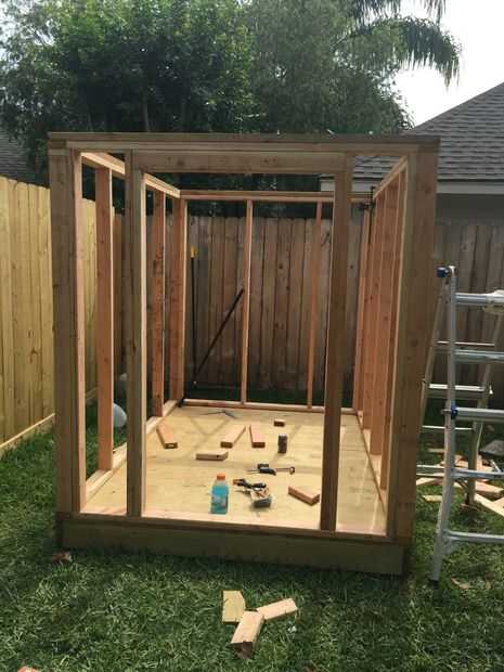 Para construir paredes necesita 4 2 × 4 a 8 pies de largos para dos lados y a otros a tamaño deseado. Para la altura de las paredes, quería que los pernos prisioneros para ser 6 pies de alto, así que empecé por cortar 2 × 4 @ 6 ft. Necesitaba 18 pernos cortan en 6 pies para todas las cuatro paredes. Luego reuní primer largo de la pared con dos pernos de 8 pies para arriba y abajo a continuación espaciados cada viga de 6 pies a 24 pulgadas en el centro. Para pared de 8 pies más largo va a necesitar cinco postes de 6 pies y 4 para cada pared más pequeños.