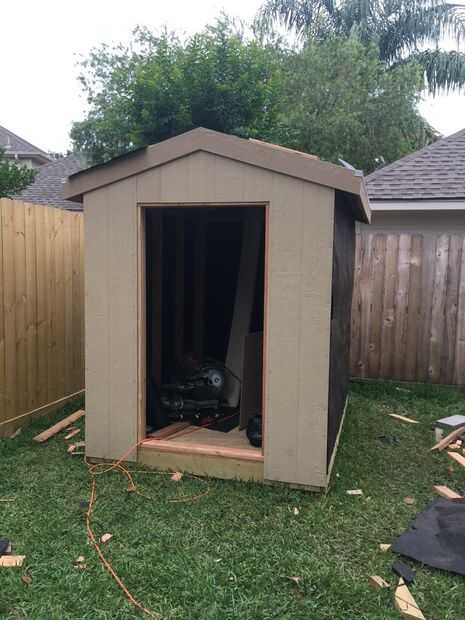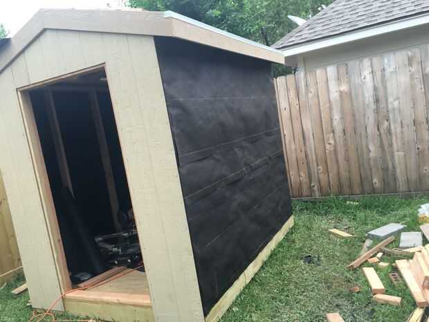 Salté la pistola y no tomó fotos de la adición de revestimiento de panel composite y guarnecido de techo. Básicamente, tomar tus 4 × 8 pies revestimiento paneles y coloque junto al edificio y corte adicional desde la parte superior con el mismo tono como techo. Para la puerta, salí abrir 1 pulgada más grande en el revestimiento de las puertas dobles. Había clavado el panel donde están los pernos prisioneros con clavos de 2 1/2 cada 6 pulgadas.
