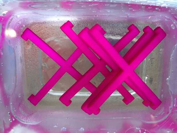 Imprimí los pros en una impresora 3d de Objet en Vero White, porque sabía que tomaría tintes bien. Una vez impreso, he seguido este instructable para teñirlos. Los colores resultaron divertida y vibrante, pero resulta que erosionaron las impresiones un poco y hacía más flexible, que en última instancia condujo a algunos problemas estructurales con la plataforma.