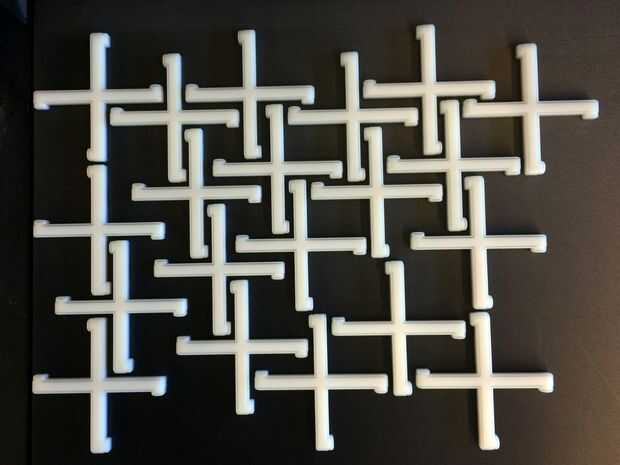 Diseñé los pros para caber dentro de un agujero de 3/8" que sería perforado en la madera. Cada pata de la plus tiene una pequeña protuberancia en la punta que es invisible una vez que se quede en su lugar, lo que el ensamblaje de estante entero parece como si por arte de magia es equilibrado en los pros.