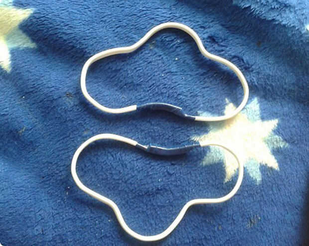 Tomar dos trozos de alambre grueso (preferible de color blanco) y doblarlos como se muestra en la foto. Los tamaños de estas piezas pueden ser diferentes en cuanto a sus necesidades y preferencias. Tan pronto como estén listas las piezas base, fijar los extremos con la cinta adhesiva (o una cinta Scotch).