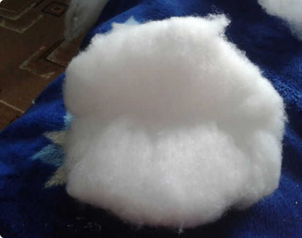 Ahora, es hora de rellenar los espacios en blanco usando el relleno de poliester. Para ello, tome un pedazo grande de material. Esto simplificará el proceso. Si una parte del material no puede ser conectada correctamente, utilice la cinta adhesiva para fijarlo.