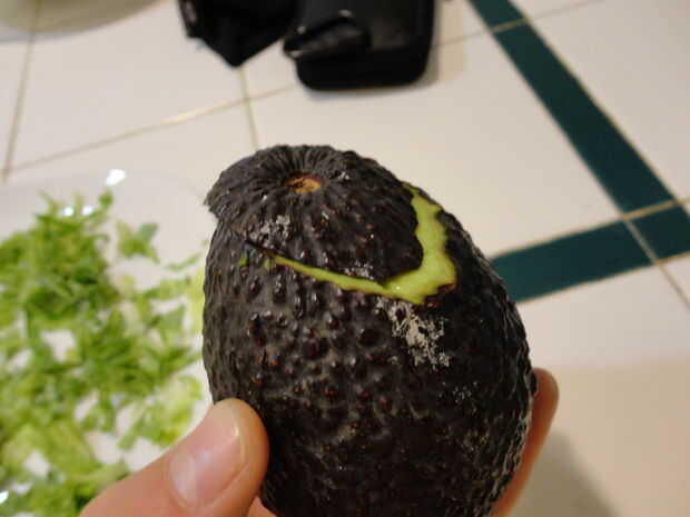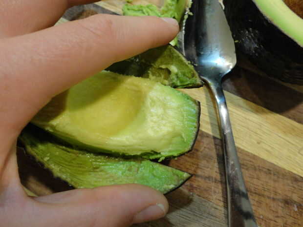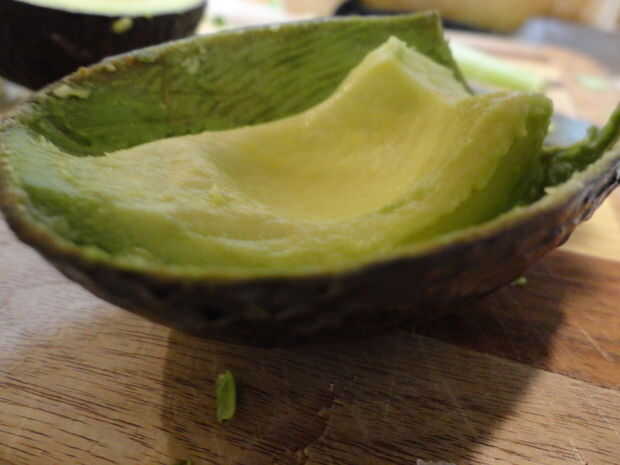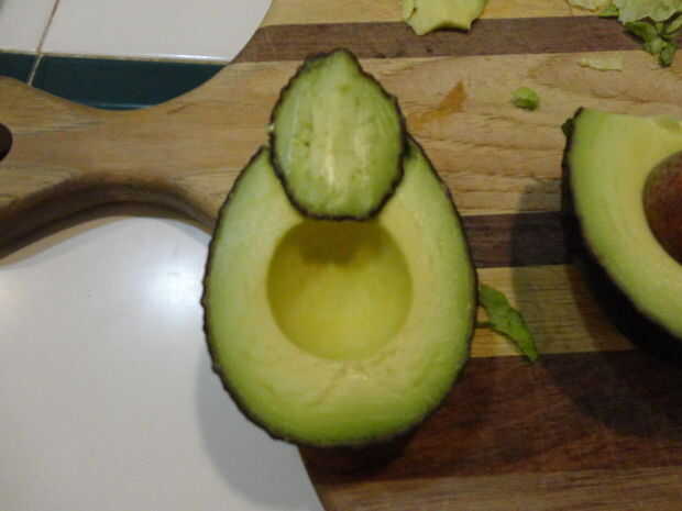 Para empezar, cortar una rebanada diagonal de la parte superior del aguacate. Se trata de la cabeza, así que lo puedes hacer redondo, oblongo, o en forma de huevo como lo hice. A continuación cortar el aguacate por la mitad lo largo, no alrededor de su Ecuador. Después de separar las dos partes, tomar una con un hoyo en ella, esto será el cuerpo y cortar alrededor de la mitad de una pulgada en ambos lados de él y separar las partes exteriores de la piel con una cuchara. Las láminas sólo deberían alcanzar el borde de donde estaba el hoyo. A continuación, cortar una curva cóncava en la parte superior del cuerpo, esto hará que espacio para la cabeza pegar. Puesto que lo único que sostenía la cabeza es el aguacate que está tocando, que como mucho la superficie de la cabeza a tocar como sea posible.