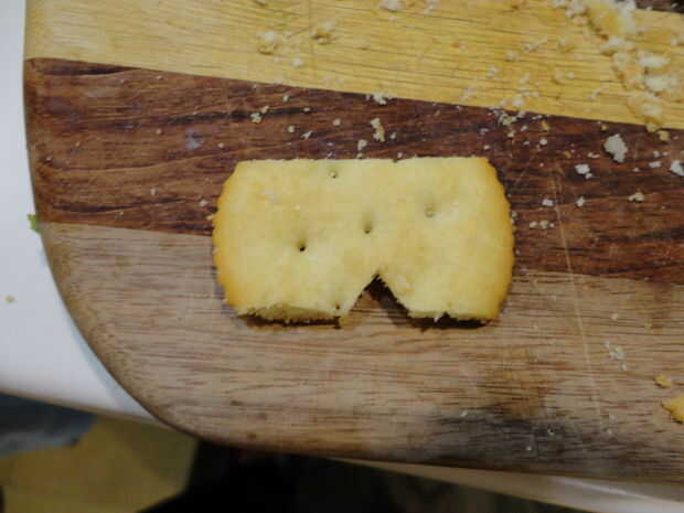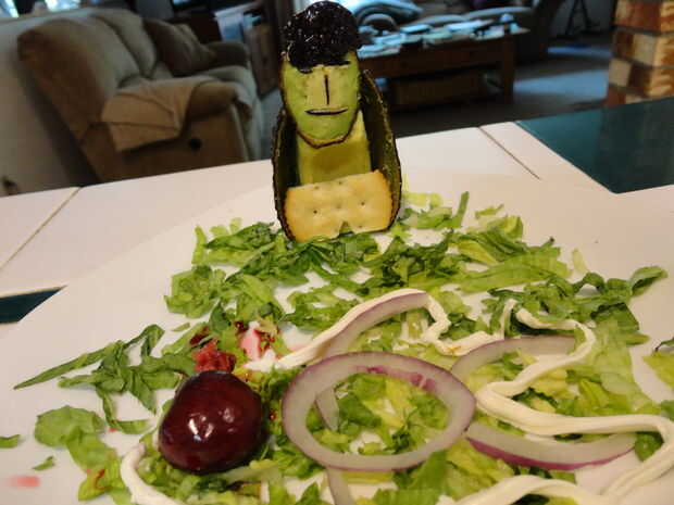 Para los pantalones, usé un cracker que corté en forma de pantalones. Tenga cuidado al cortar la galleta porque como su nombre indica, puede agrietarse. Afeite la parte inferior del cuerpo manera que esté plana y cuña las galleta pantalones entre los lados del aguacate; ajusta su posicionamiento en el aguacate para que Holmes se sostiene en pie por sí mismo. Ahora pulsa el sombrero en la cabeza y la cabeza sobre el cuerpo. Finalmente! Su acabado Holmes de aguacate! Póngalo en el plato para que vistas con escepticismo la escena del crimen.