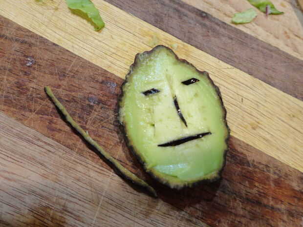 Después se hace el cuerpo y la cabeza corta, es tiempo para hacer los detalles de terminación. Para poner los ojos, boca y nariz de aguacate Holmes, cortar una fina tira de piel de la mitad del aguacate que no está siendo utilizado. Corte la tira en trozos más pequeños para las características de la cara y hacer cortes poco profundos ante el aguacate para la piel. Después de que las características de la cara se cortan y se hacen pequeñas incisiones para acomodarlos en la cara, presione suavemente los ojos, luego la nariz, luego boca, sobre la cara. Una vez que ha terminado la cara, debe hacer la firma sombrero de Sherlock Holmes. Para ello, cortar una cuarta parte de la piel de la otra mitad del aguacate y quitar la carne. Lo siento no tengo fotos de esta parte. ¡ Después de cortar la parte superior redondeada del sombrero, cortar un ángulo diagonal bill, esto hará que se vea "3D".