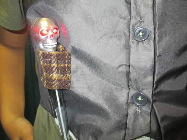Había cosido un tira/lazo en el otro lado. El tubo es lindo, aunque un poco abultado, que la lupa es aún más lindo, pero demasiado inestables para ser funcional, por lo que la pluma del light-up del cráneo es dueño del final de la extensión simétrica.