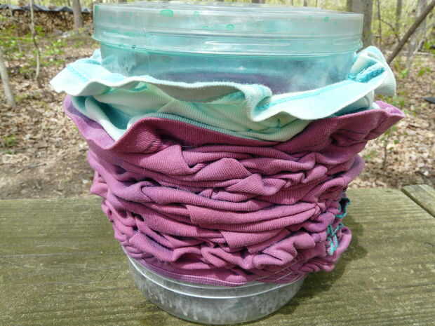 Asegúrese de que está fuera y ropa vieja para esta parte siguiente: rociar la camisa envuelta todo con la mezcla de lejía y agua. Haz agradable y húmedo y dejar reposar allí de 5 a 10 minutos. El color se consigue más ligero cuanto más se sienta, así que siéntate ya si quieres rayas de mayor contraste. No lo deje reposar más de 10 minutos, o pueden debilitar a la tela de la camiseta.
