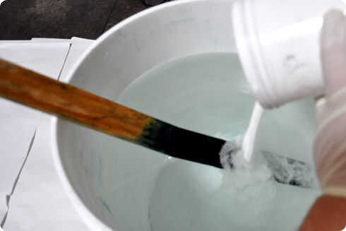 Llenar su cubo con agua caliente del grifo. Agregue el removedor de Color y ceniza de Soda y revuelva hasta que se disuelvan.
