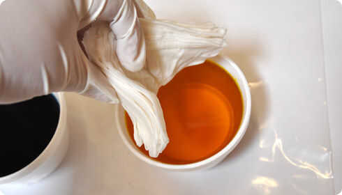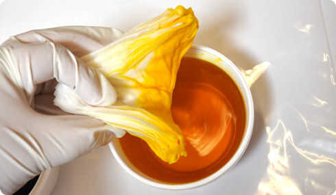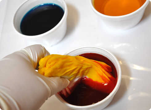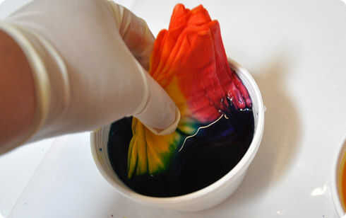Empezando con el amarillo, un borde o una esquina de la bufanda de la inmersión en el recipiente, sostenerlo en el tinte durante unos pocos segundos.