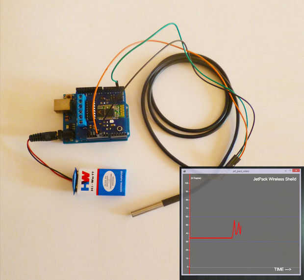 Jetpack es un Bluetooth y controlador de motor escudo programa Arduino inalámbricamente. Pensamos supervisión en tiempo real datos sería una aplicación muy interesante así que tenemos un diseño de una sistema de control de la temperatura, puede leer los datos con una sonda de temperatura y se puede graficar en tiempo real con el software de procesamiento de