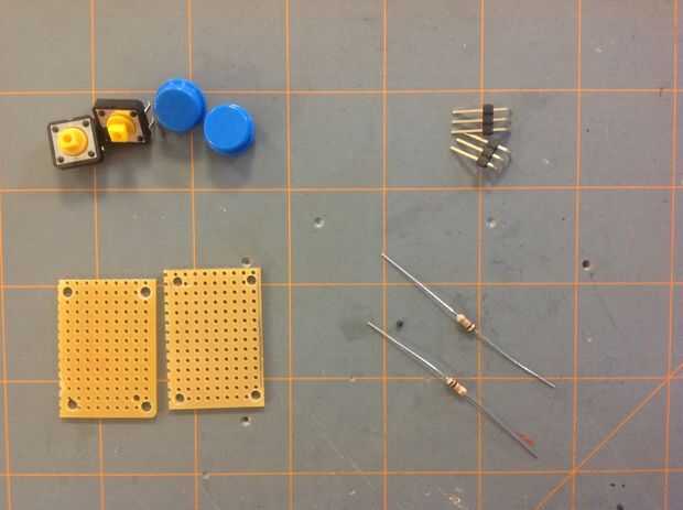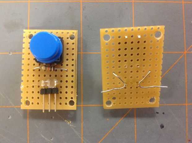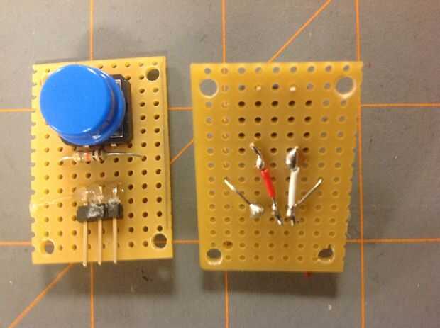 Pegamento caliente los componentes en lugar como se muestra a la izquierda de la figura 2-2. En la parte posterior del sensor, doblar las puntas de la resistencia hacia las clavijas del conector de tres clavijas exteriores y soldadura. Soldar un cable blanco desde el perno de la señal a un lado del interruptor. Soldar un cable rojo desde el perno de tensión hacia el otro lado del interruptor. No te olvides de todos los interruptor de cuatro hilos para la estabilidad de la soldadura. (Originalmente solo soldar los dos cables conectados a los cables y el botón comenzó a roca ida y vuelta).