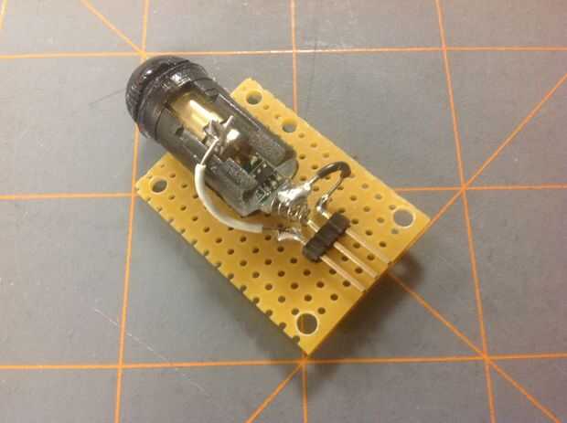 Suavemente desmontar el puntero láser y eliminar el componente láser. Asegúrese de identificar a los contactos positivos y negativos para el láser. Pegamento caliente el láser y el conector de tres clavijas a la Junta del sensor como se muestra en la figura 7-2. En el laser que usé, el contacto negativo fue el resorte que iban para el lado negativo de las baterías de puntero láser. El positivo fue que el botón de puntero láser en contacto con la unidad láser. El plomo negativo láser con el conector de tierra con un cable negro de la soldadura y soldar el plomo positivo láser con el conector de señal con un cable blanco.