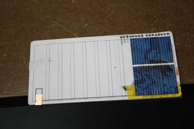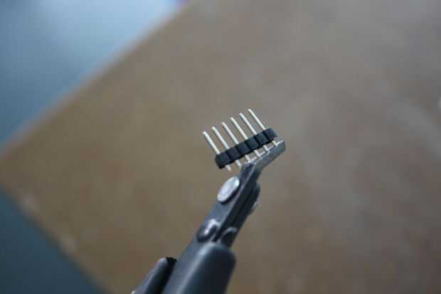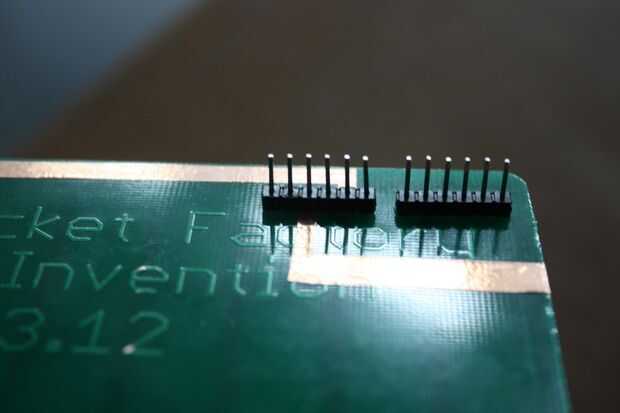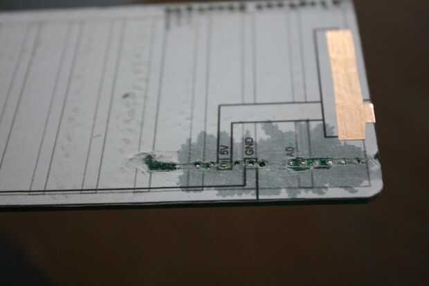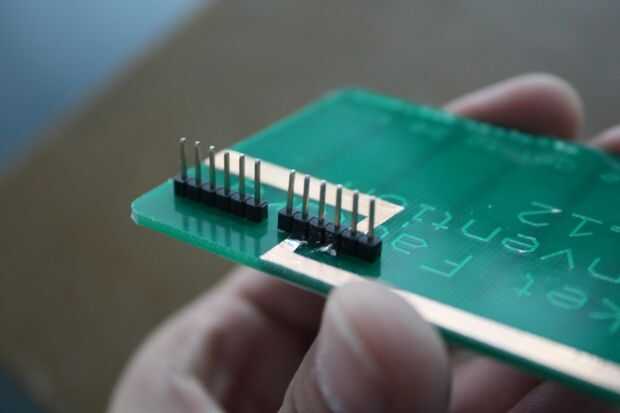 Para hacer esto, cortado el encabezado hacia abajo un poco, para asegurarse de que las tapas no sobresalir de la superficie superior de mi respaldo. Y entonces me resbalé en dos gotas de estaño en la parte inferior de la base, en los 5V y GND pernos. Esto resultó para ser más fácil de lo que esperaba, como las mechas de soldadura justo a lo largo de la cinta de cobre muy bien. Necesitaba para recalentar la soldadura una segunda vez para obtener las cabeceras bien alineadas, pero funcionaba bien.