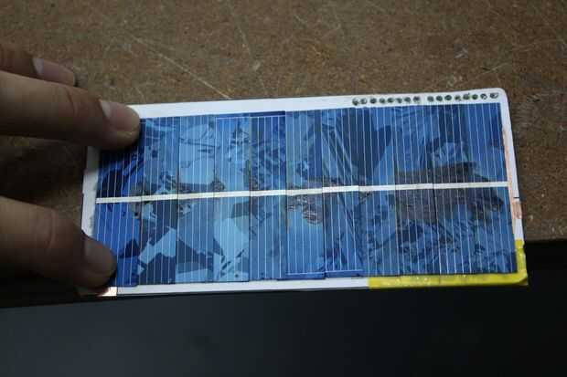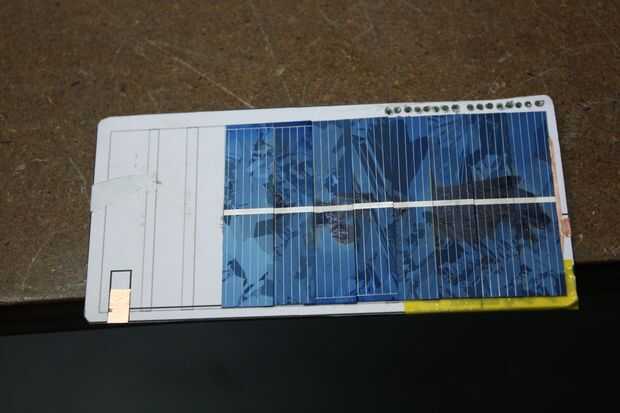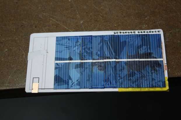 Unos toques de pegamento (una vez más, regular Crazyglue funcionará, pero analiza a temperaturas de 80 ° C, por lo que te recomiendo utiliza cianocrilato temp alta en línea o disponible en los Kits de bolsillo Solar un número de lugares, incluyendo aquí), unos segundos de presión, y usted mismo tiene una conexión de serie solar! Repetir 11 veces. Asegúrese de utilizar esta misma técnica de conexión con las dos conexiones de cobre. Si una de las conexiones falla (y he probado el voltaje y corriente después coloqué cada solettes para asegurarse de que no había un solette defectuoso o una conexión de cortocircuito), usted puede generalmente reparar con alguna soldadura, particular si la conexión está en la cinta de cobre - ensambladura de solette. Tuve que hacer una reparación de tal en el cruce de la tierra.