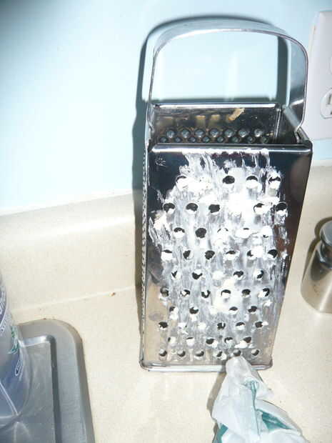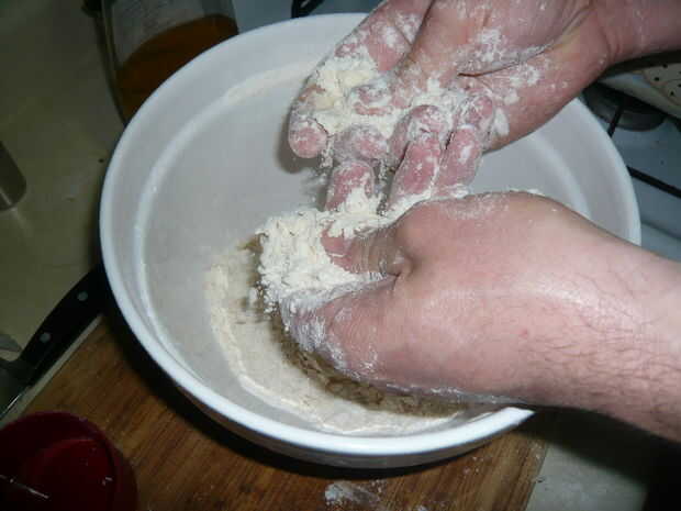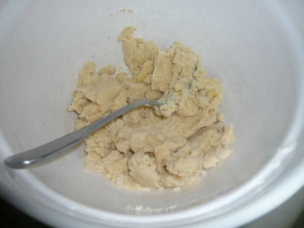Añadir la mantequilla rallada. Frotar la mantequilla entre los dedos hasta que tenga una textura grumosa.