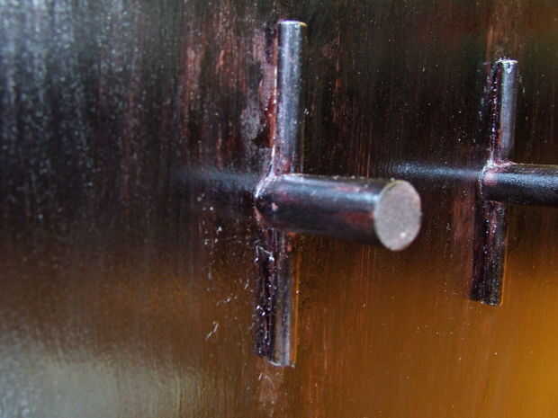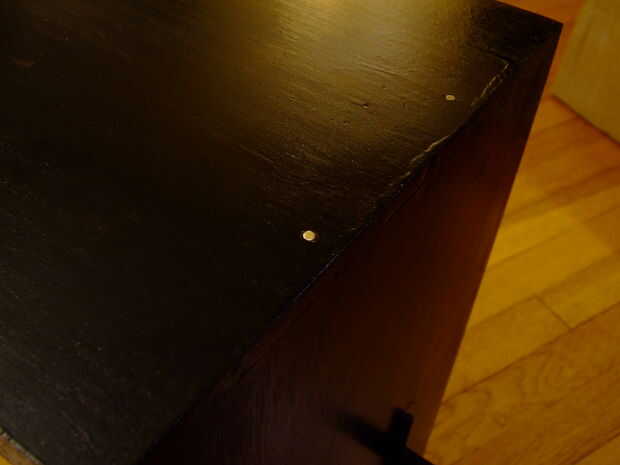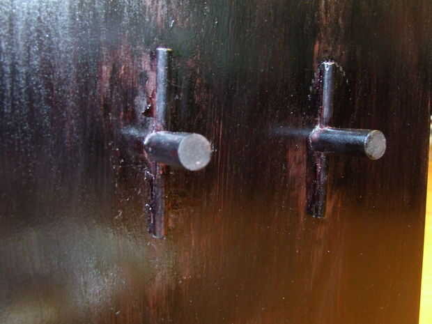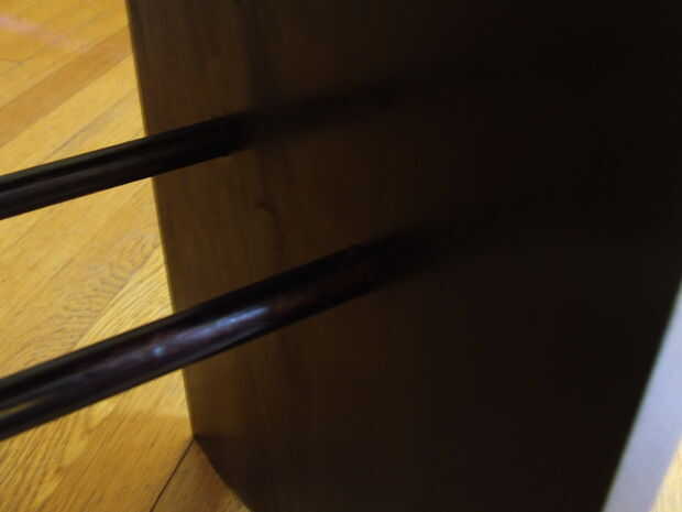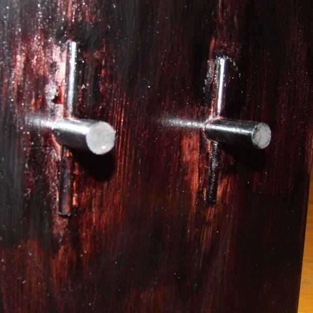 El Banco mide unos 24" por 10" 18" y está hecho de álamo de 1" (en realidad 3/4"). Las barras para el estante del zapato son fabricadas en 1/2" espiga y cubrió con 1/4" espiga. Perforar cuatro agujeros de 1/8" corto en la parte superior del Banco y acabado con un color marrón rojizo (al parecer se llama cordobés) goma laca. Una capa era todo que lo tomó. Después de terminar martilló algunos pequeños tramos de varilla de latón de 1/8" en el los agujeros ha perforado, que hace que parezca más fresco de lo que se piensa, entonces lo pulimentado con algunos extra fina lana de acero para opacar el brillo un poco.